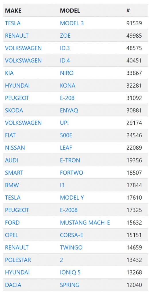 Între cele două modele bine cunoscute, cumpărătorii din zece piețe europene majore s-au decis pentru 20 de modele 100% electrice.