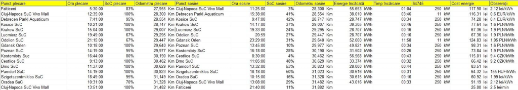 - Număr încărcări: 15, conform tabelului de mai jos, din care 13 la SuperCharger și 2 peste noapte lângă cazare