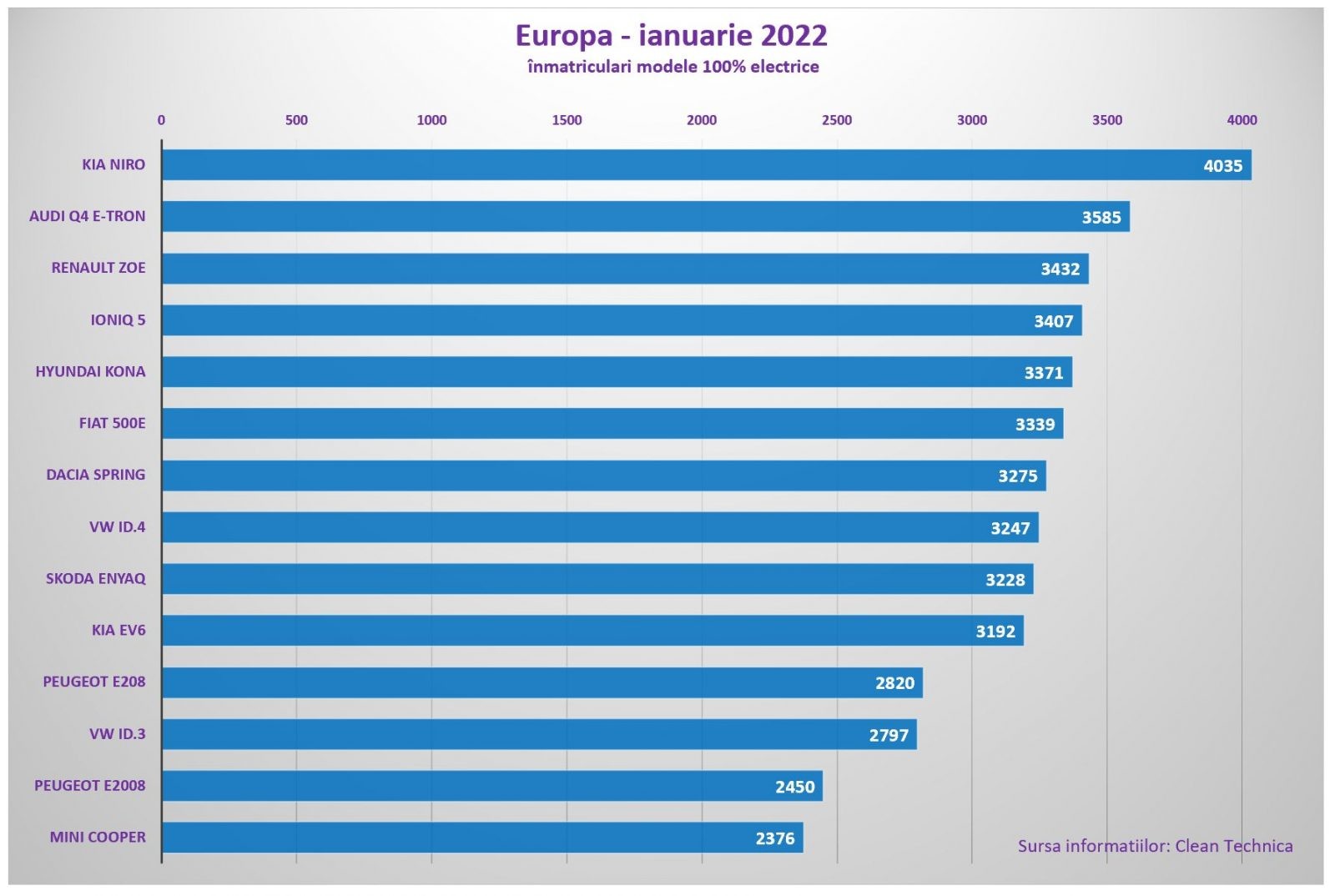 In absența livrărilor pentru Europa de Model 3 și Y în ianuarie, TOP 15 a fost definit de cei mai harnici importatori din Coreea, grupul Hyundai-Kia reușind să plaseze patru modele în Top 10, în ordinea: Niro, IONIQ 5, Kona și EV 6. Startul bun al platformei dedicate E-GMP, împărțită în prezent de IONIQ 5 și EV 6, este foarte promițătoare pentru gama electrică în diversificare rapidă a grupului coreean.