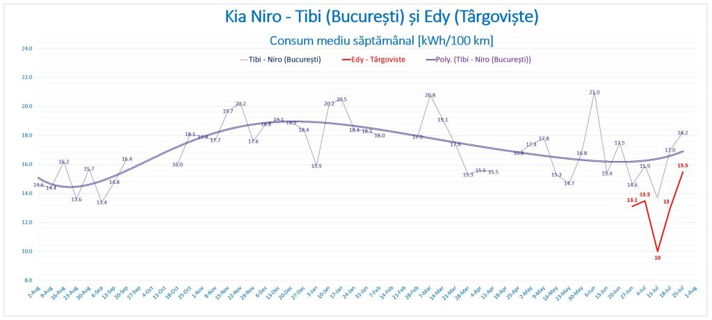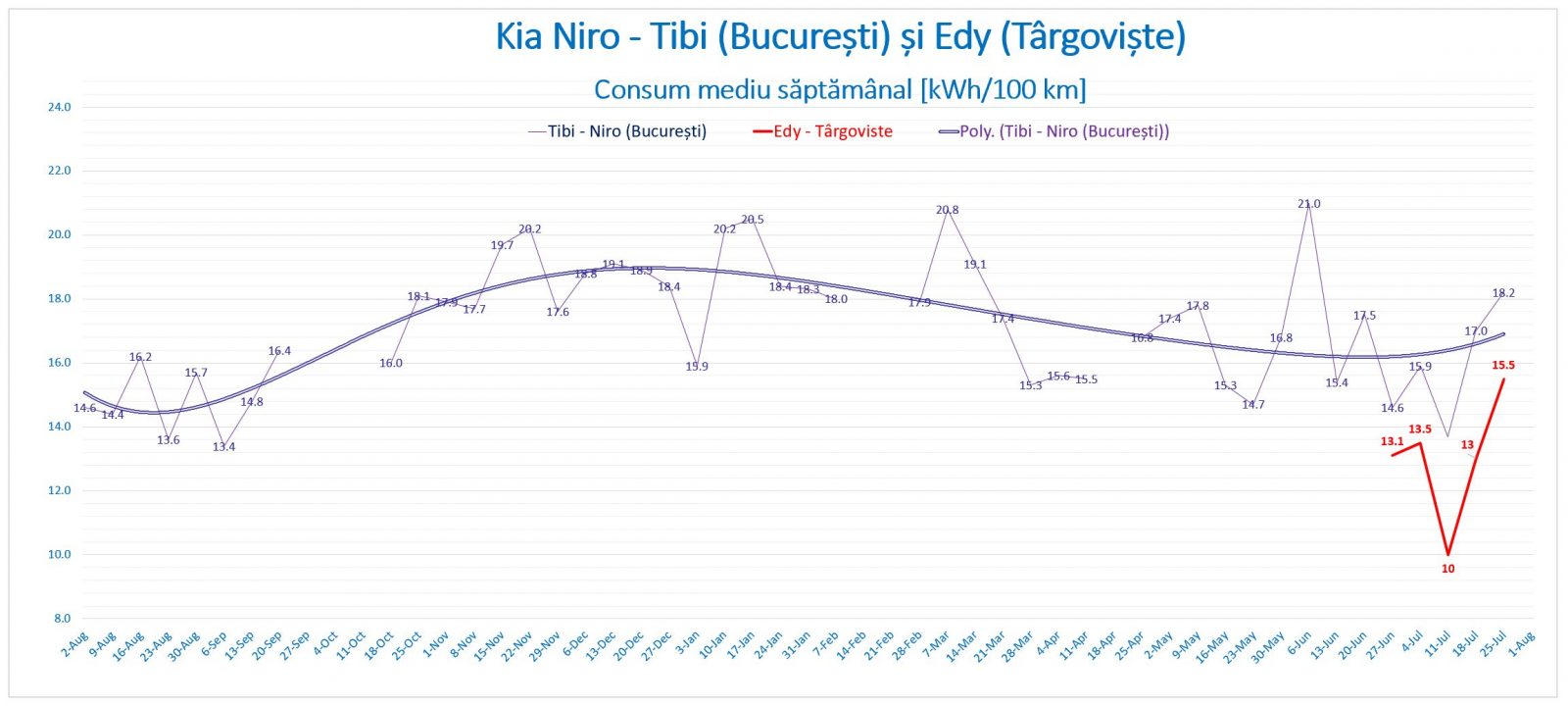 În săptămâna 1-7 august, Niro a parcurs 599 km cu consumuri medii între 11.6 și 14.4 kWh/100 km (valoarea medie ponderată calculată pentru săptămâna trecută:12.5 kWh/100km).