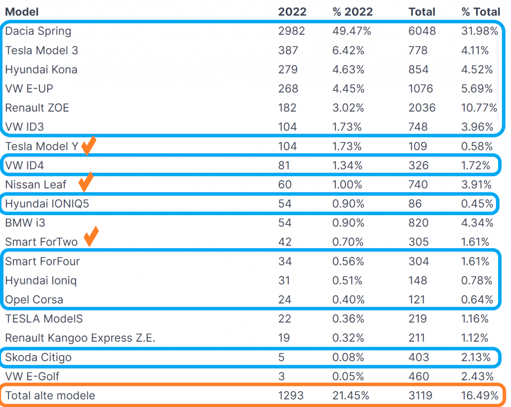 O privire la parcul auto electric actual (coloana Total) dar și la înmatriculările din acest an (coloana 2022) va dezvălui că proprietarii a opt modele din Top 10 participă în prezent la proiectul Electromobilitate cu date săptămânale și experiențe alături de mașina familiei.