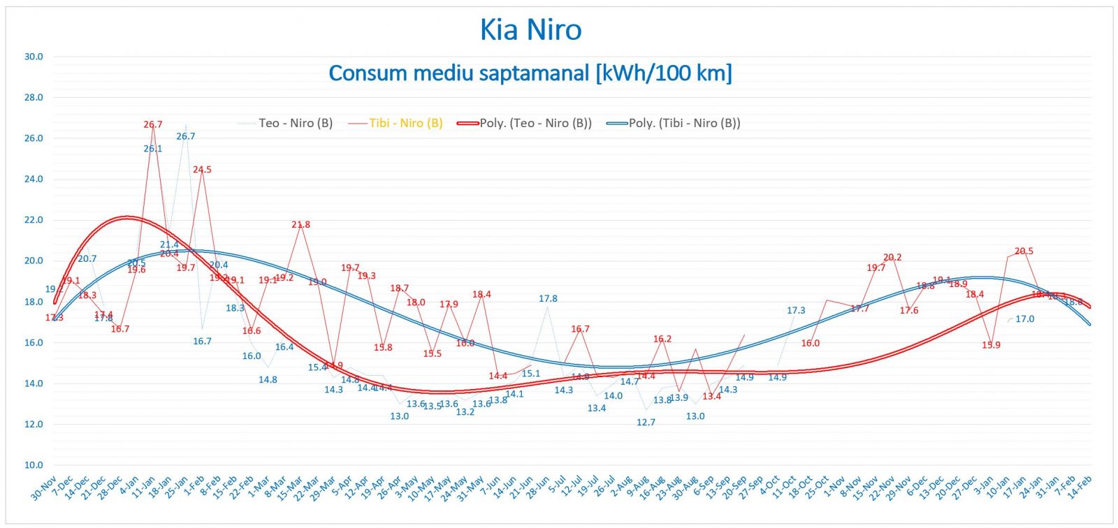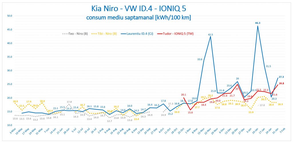 În comparația consumului mediu săptămânal, ambele Niro se comportă mai bine în perioada de iarnă, decât noile ID.4 și IONIQ 5, dar trebuie să ținem cont de gabaritul mai redus al spațiului interior ce trebuie încălzit, dar și al acumulatorului, din aceleași motive.