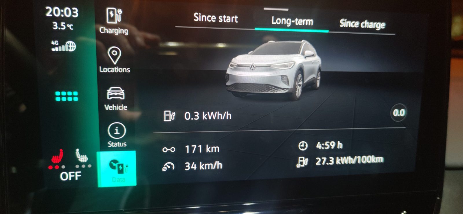 Nimic deosebit cu ID.4, consumuri mari în timpul săptămânii, pe drumurile scurte din oraș (50 kWh/100 km), consumul mediu scăzând la drumurile din afara localității, unde sunt în jur de 20 kWh/100 km.