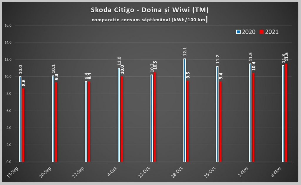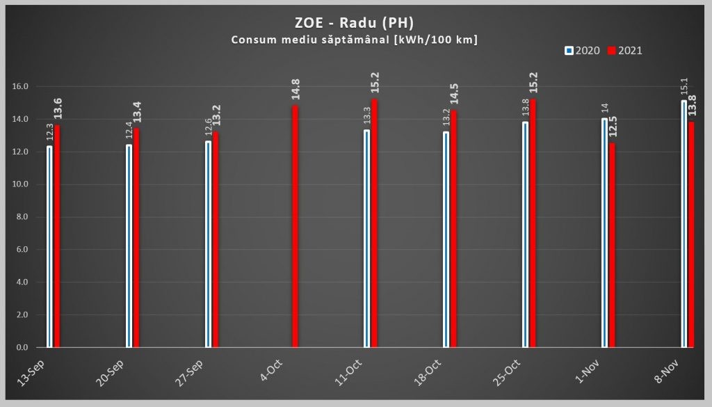 Daca v-ați pripit să trageți concluzia că în al doilea an electromobiliștii își cunosc mai bine mașinile și reducerea autonomiei nu-i mai sperie, generând un consum mai mare datorită (poate) condusului mai sportiv, Radu vine să infirme aceasta ipoteză în noiembrie, când consumul mediu a fost mai mic decât cel comunicat anul trecut. Este adevărat, că și vremea a fost ceva mai blândă și acest lucru poate fi cauza diferenței de 9-10% față de anul trecut.