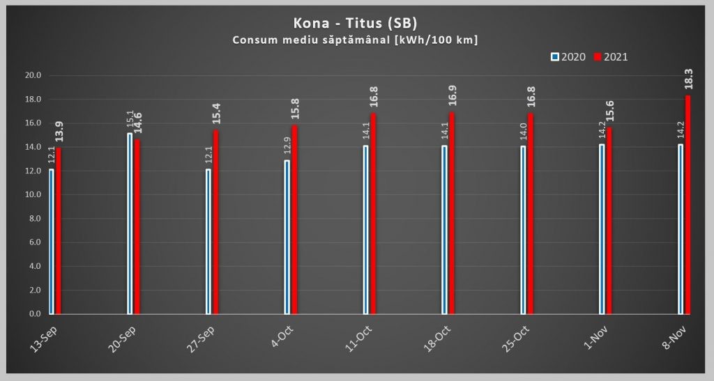 Fiind vorba de drumuri parcurse exclusiv în București, cu viteză medie redusă, creșterea consumului are alte cauze, decât cele amintite în cazul Kona – Titus. O combinație de durată a preîncălzirii, condiții de drum, temperatura exterioară și interioară, poate fi cauza acestei creșteri, grija deosebită pentru autonomie din primul an diminuându-se.