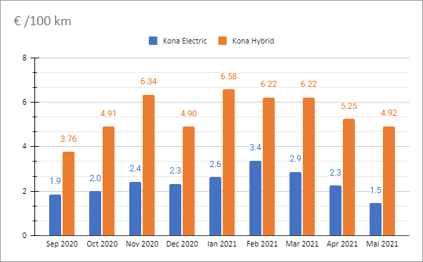Prețul pentru 100 km, în cazul modelului electric, este calculat prin împărțirea costului total generat de încărcări (la priza de acasă + stații publice) la distanța parcursă. Am ales acest mod de a calcula deoarece în unele locuri (tot mai puține), încărcare este gratuită, fie la birou, fie la diferite centre comerciale, iar în acest fel obținem valori cât mai apropiate de realitate.