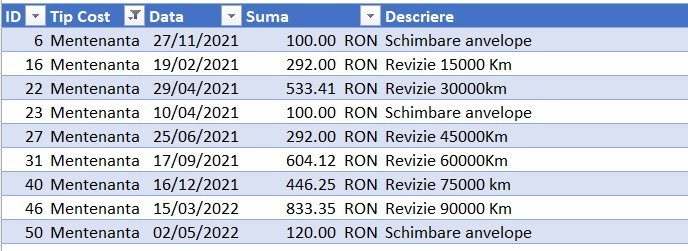 Mai jos sunt expuse costurile de mentenanță (revizii și servicii de montaj anvelope) pe care le-am avut până acum cu Kona: