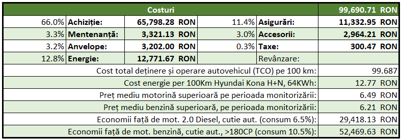 Însă, diferența costului necesar energiei de propulsie a Konei, raportată la ipotetic necesare cu combustibilul, clasifică investiția în Kona EV ca fiind una din cele mai rentabile investiții făcute de mine până acum.