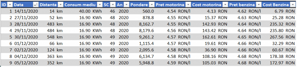 De când am electrica, am ținut evidența cu prețul la zi al combustibilului, așa cum este el afișat pe peco-online. Comparația e făcută strict pe distanțele efectuate și costul la zi al energiei și al combustibilului.