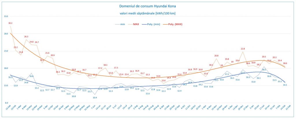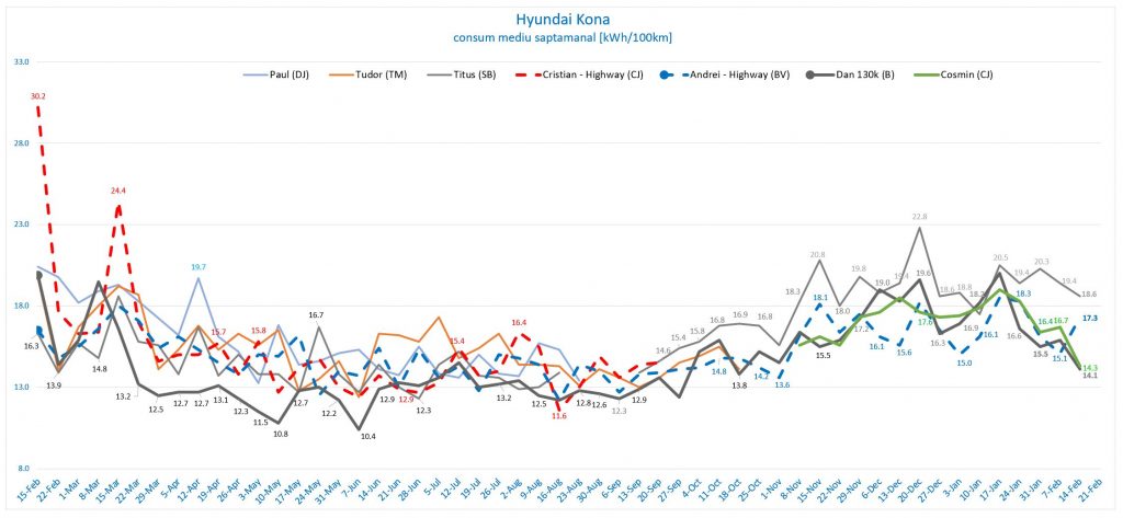Săptămâna #7 în echipa Hyundai Kona avem raportați 2117.8 km și un consum mediu pe echipa de 16.09 kWh/100km. In graficele de mai jos se observa foarte bine scăderea consumului mediu pe ultima perioadă analizată.