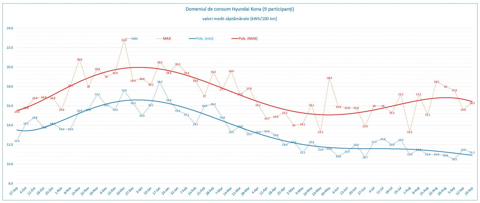 Datele sunt sintetizate într-un tabel, ca de obicei. Mai jos vom avea și graficele care prezintă consumul mediu săptămânal și domeniul de consum.