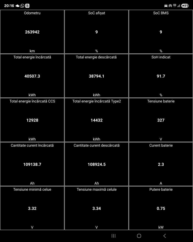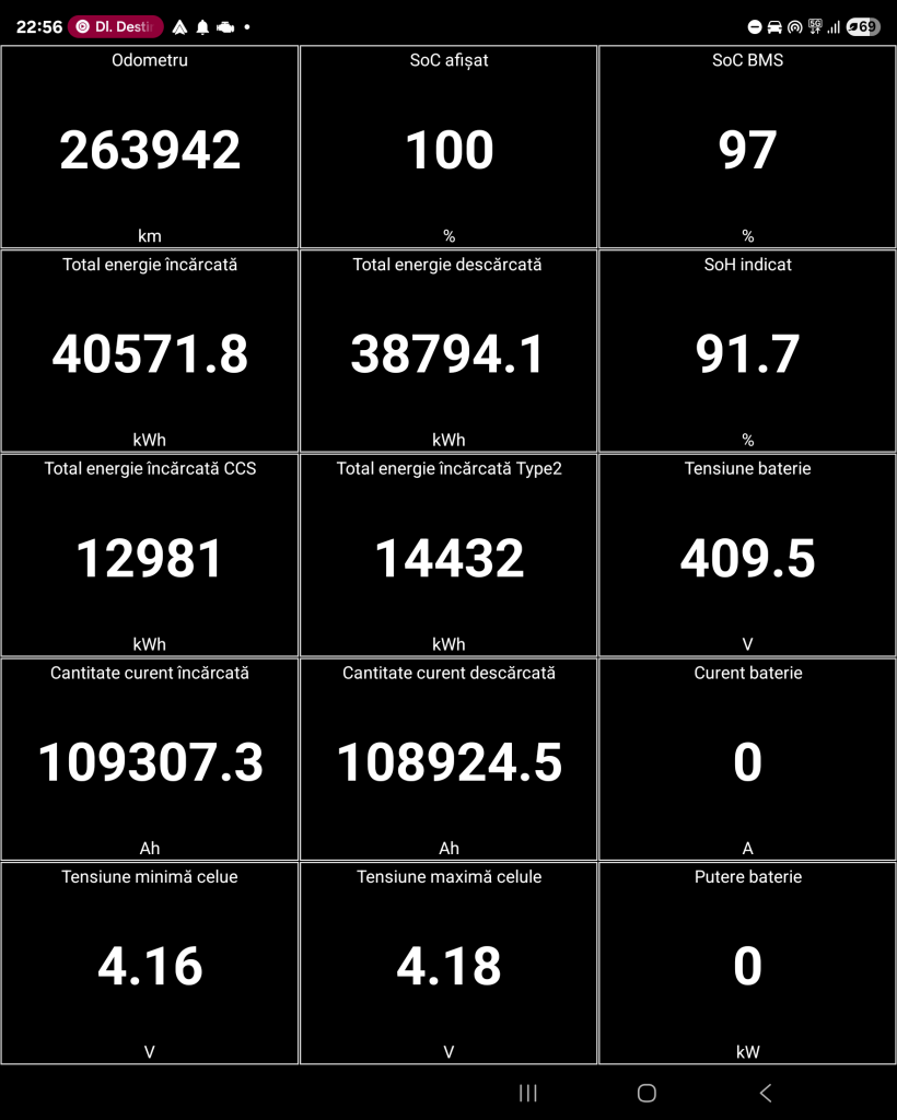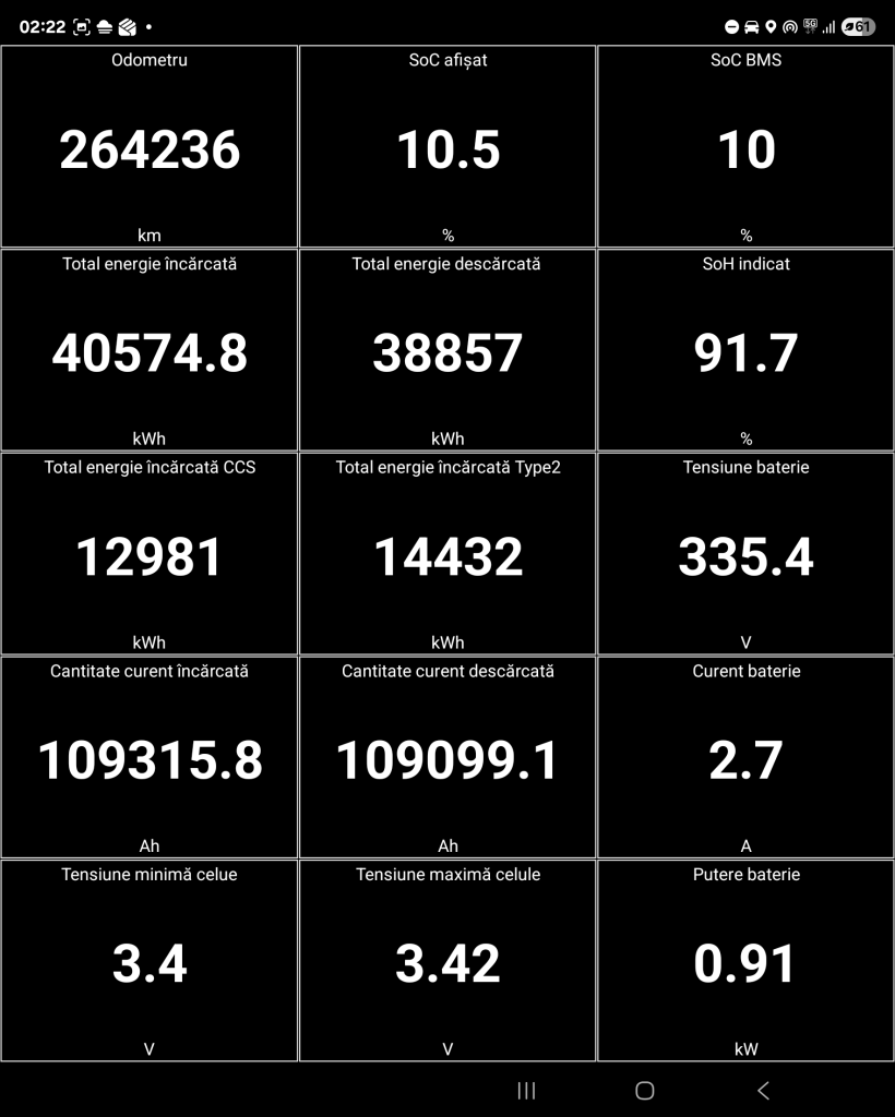 Pe de alta parte nu stiu cat de real e acel parametru. Dintr-un prim test facut de mine am iesti clar cu o capacitate peste ceea ce spune acel paramentru. Zicea si Alex (SB) ca a vazut la Kona lui 61.x kWh pe acel parametru, lucru pe care-l confirm si eu.