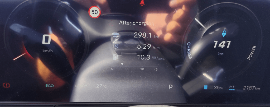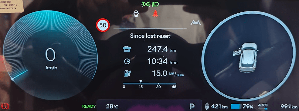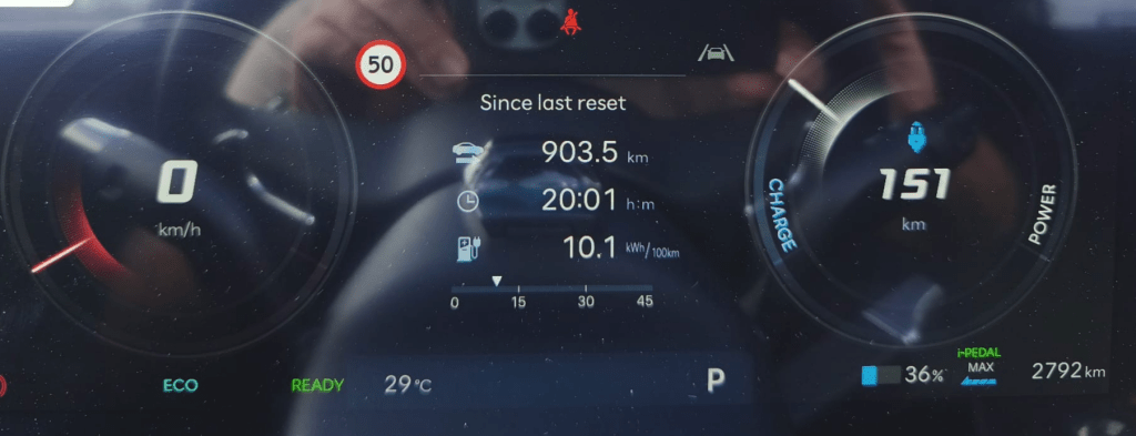 Consumul de 14.3 kWh/100 km reflectă în mare parte tot acest drum lung. Mersul ceva mai alert pe autostrăzile Europei are acest efect.