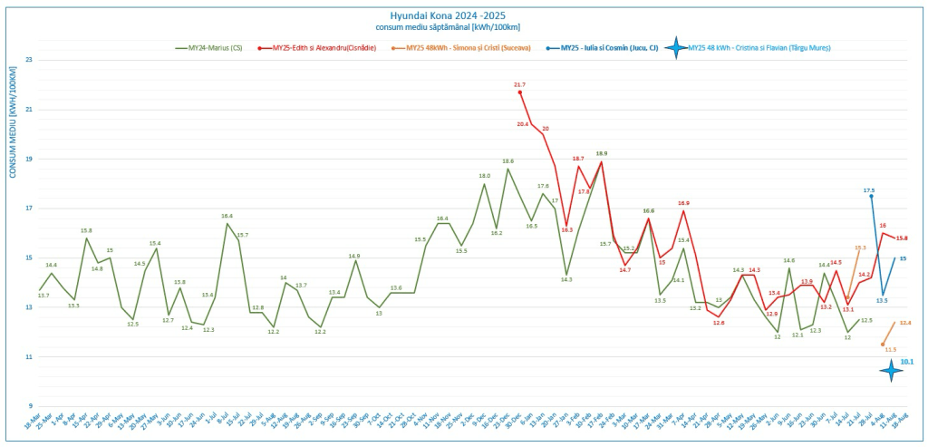 Săptămâna aceasta, alături de recordul celor 260 de rapoarte săptămânale transmise de Titus (Sibiu), semnalam debutul celui de-al patrulea echipaj mixt pentru cronica săptămânală a echipei Kona, fără să uităm de Diana și Dani (Bran) care transmit datele și experiențele la volan lunar.