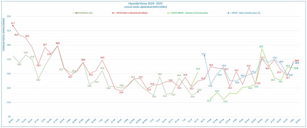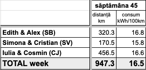 O săptămână mai răcoroasă care ne duce spre o medie de consum mai mare. Sub 1.000 km parcurși de cele trei echipaje din subgrupa noilor #konițe, cu o medie ponderată de consum de 16.5 kWh/100 km, destul de bine peste precedenta raportare.