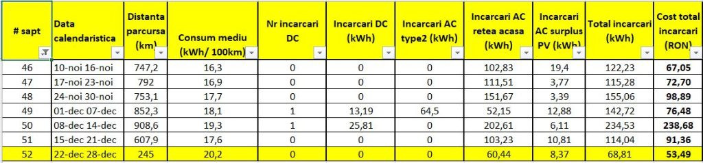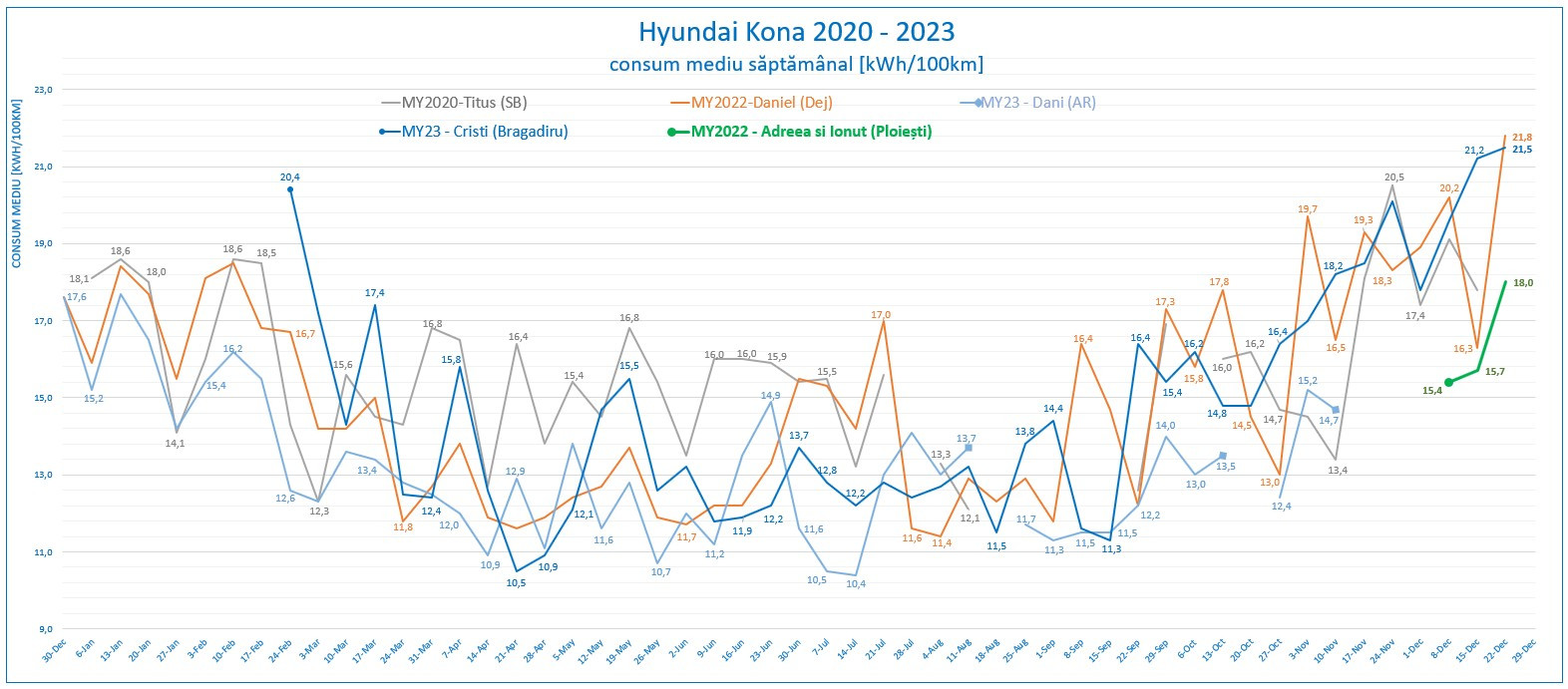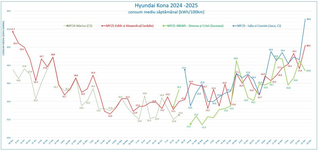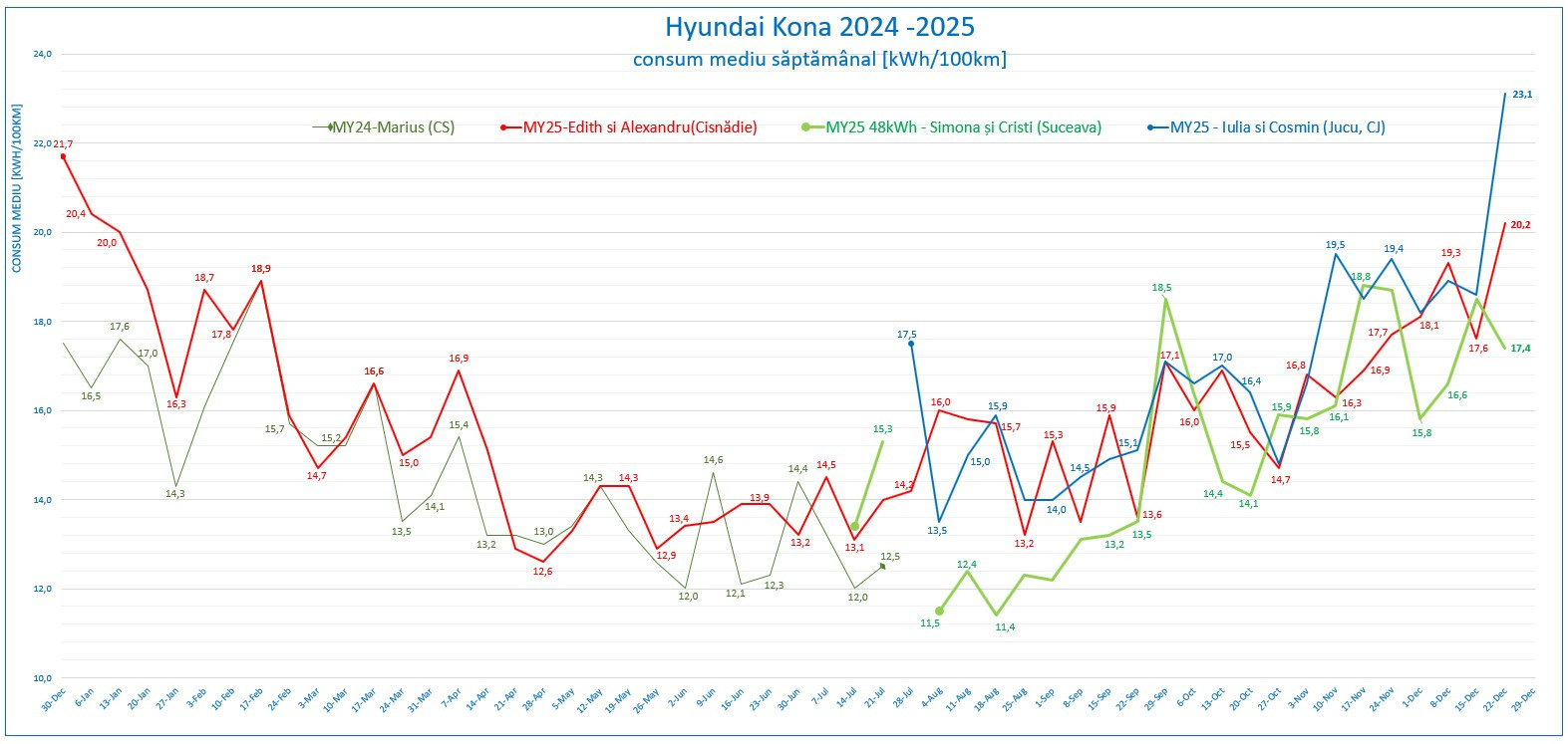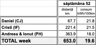 Cele trei #konițe care au raportat date pentru ultima săptămână din 2025 au parcurs 653 km cu un consum de 19.6 kWh/100 km. Consum tras în jos de echipa Andreea și Ionuț, drumurile lor mai lungi s-au finalizat cu un consum mai mic, după cum bine se vede.
