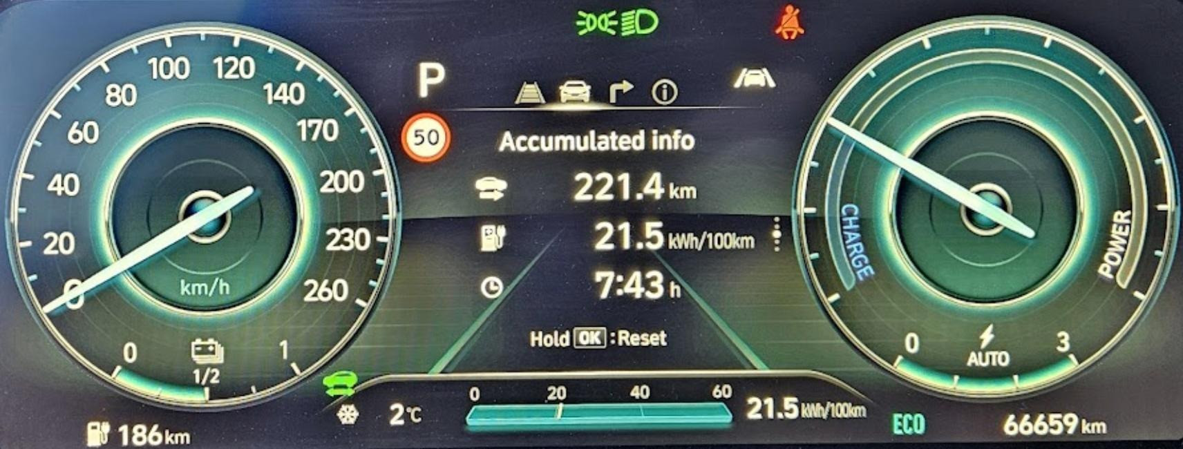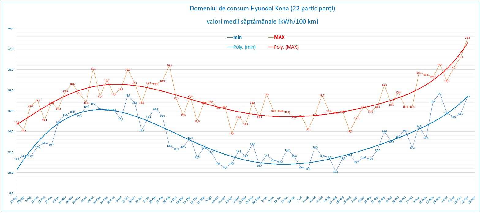 Consumul a fost unul care indică drumuri scurte și/sau pe autostradă în cazul celor două Kona SX2 cu acumulatorul mare, avem detalii mai jos direct de la proprietarii-voluntari. Încheiem ultima săptămână cu cel mai mare consum ponderat din 2025, 19 kWh/100 km.