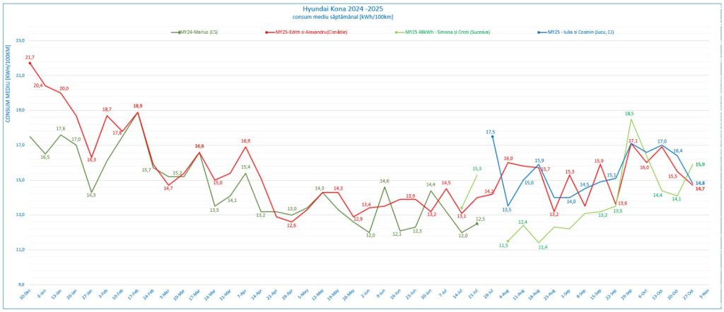 După una rece, una caldă, alta și mai caldă venim cu o scădere drastică de consum. O medie ponderată pe echipă de 14.8 kWh/100 km. Un consum bun pentru această perioadă, chiar cu penalizarea indusă de drumuri scurte raportate de Simona&Cristian.