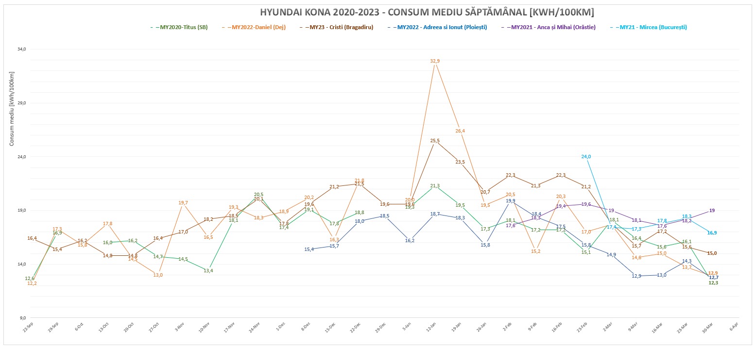 Trei dintre colegi s-au înghesuit în intervalul 12.3-12.9 kWh/100km, după cum observăm în graficul care reprezintă consumul mediu săptămânal raportat de mașini. Alte două scăderi și o singură creștere de consum.