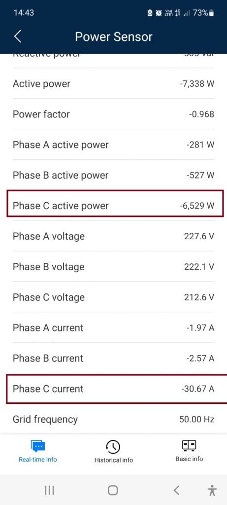 – momentan am folosit doar încărcări de acasă, se poate vedea că trage cu aproximativ 31 amperi – printscreen din aplicația fotovoltaică cu consumul pe faza respectivă;