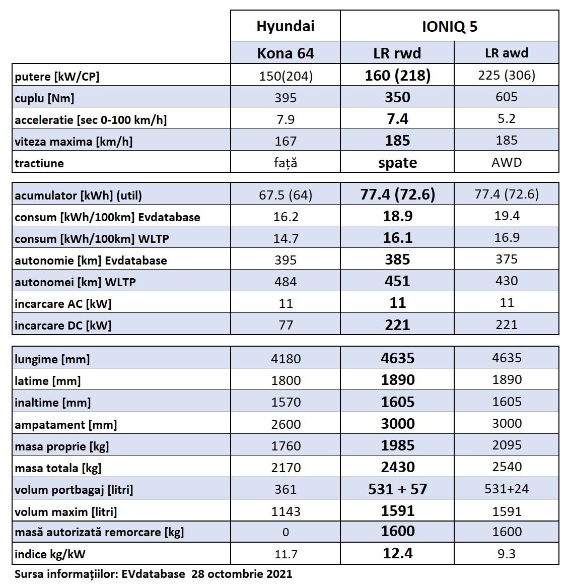 O privire la specificatiile tehnice menține Kona în imediata apropiere a variantei LR cu tracțiune spate (aleasă de noi pentru proiectul Electromobilitate) în ce privește performanțele dinamice, chiar cu un mic plus pentru autonomie.