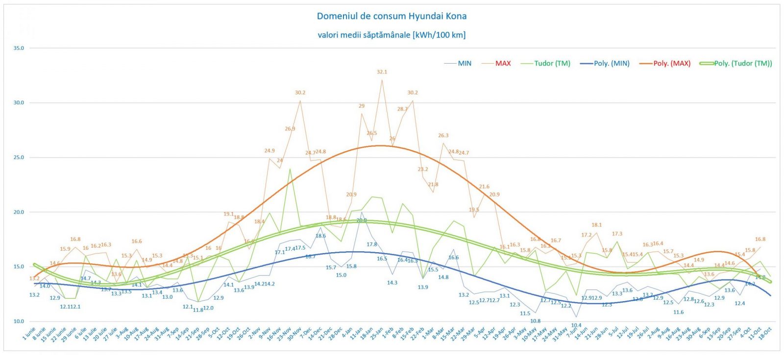 Konașii au definit un domeniu care atinge primăvara și toamna valorile de consum și autonomie WLTP, iar în sezonul rece urcă în funcție de nevoile individuale de climatizare, traseu, condiții atmosferice și viteză de deplasare. Undeva între valorile maxime (roșu) și cele minime (albastru) se distinge evoluția lui Porto (verde), în majoritatea celor peste 26.000 km cu Tudor la volan, dar și cu câteva mii de kilometri parcurși în cadrul test drive-urilor.