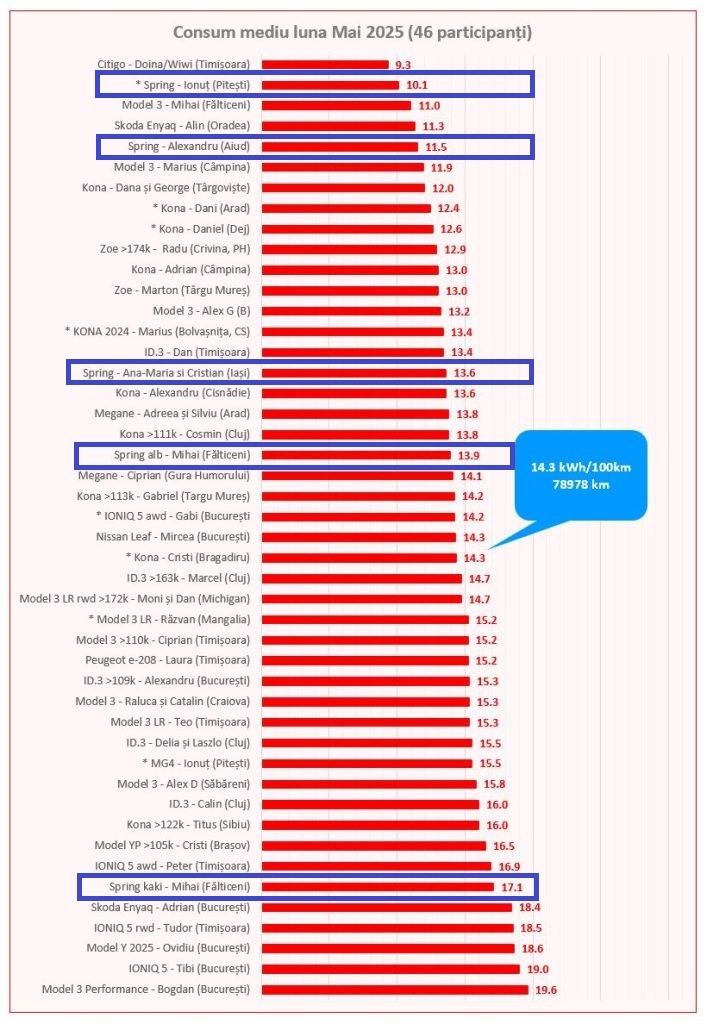 Imaginile primite de la Alexandru (Aiud) ne aduc aminte că Spring-ului îi stă foarte bine și la drum lung, dovadă cei 2864 km parcurși în luna mai pentru un cost al energiei de… 397 lei. Exemplul lui Alexandru, cu electroni încărcați în proporție de peste 95% din rețelele publice la un cost de 13.86 lei/100 km (sub 2 litri/100 km benzină/motorină) confirmă, încă o dată, avantajul utilizării unei mașini electrice.