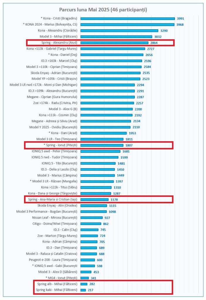 Celelalte patru Spring-uri din proiectul Electromobilitate încărcă 100% de la instalațiile de panouri fotovoltaice, susținând călătoriile, zi de zi, prin oraș sau în afara lui. Ana-Maria și Cristi prin Iași – 1178 km, Ionuț prin Pitești și în jurul lui – 1807 km.