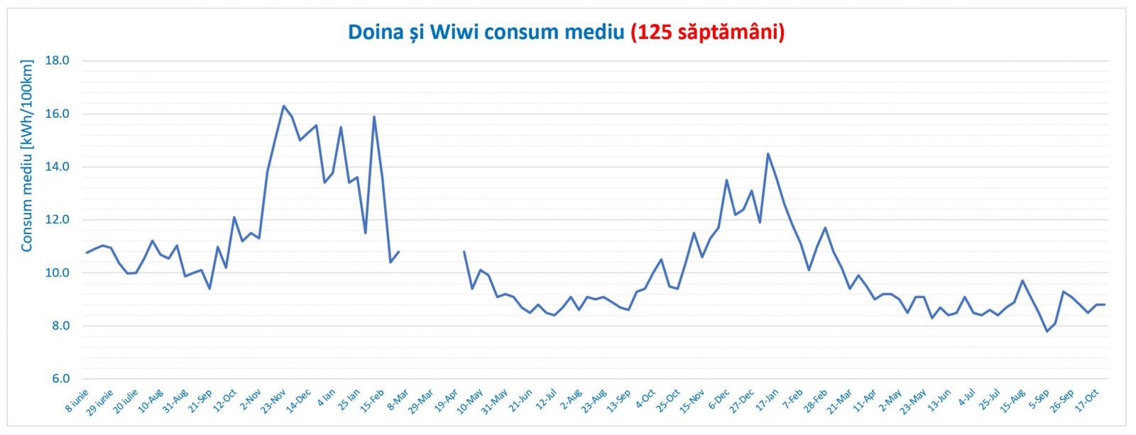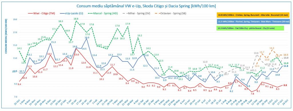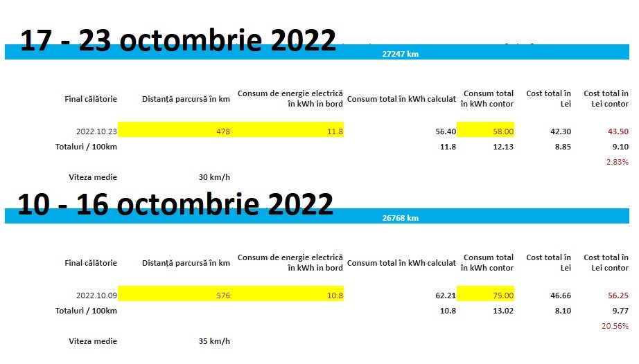 - Medie consum energie bord: 11.8 kWh / 100 km (17-23 oct);