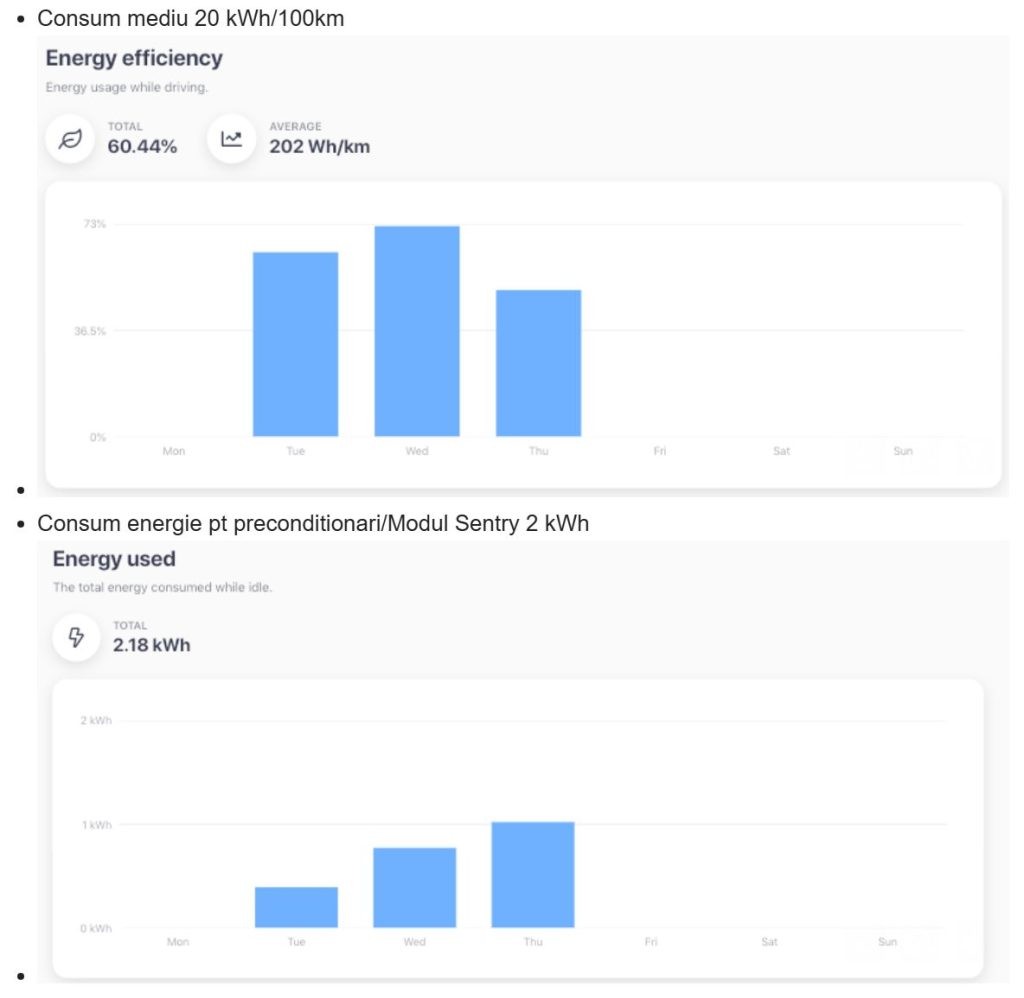 - Energie consumată în Park: 15.6 kWh (Sentry 60 ore, Vehicul în așteptare, Ecran, Protecția supraîncălzirii cabinei)