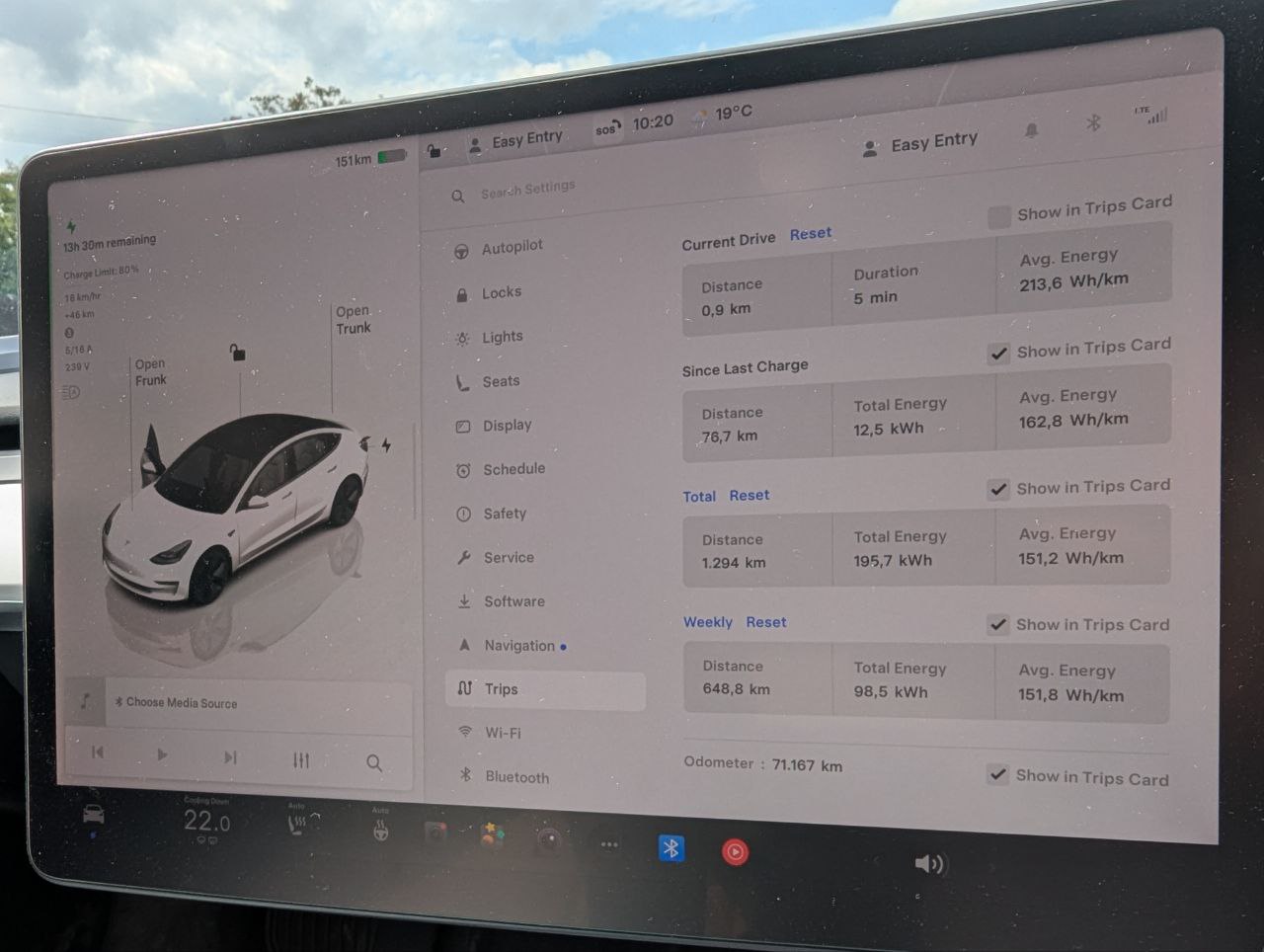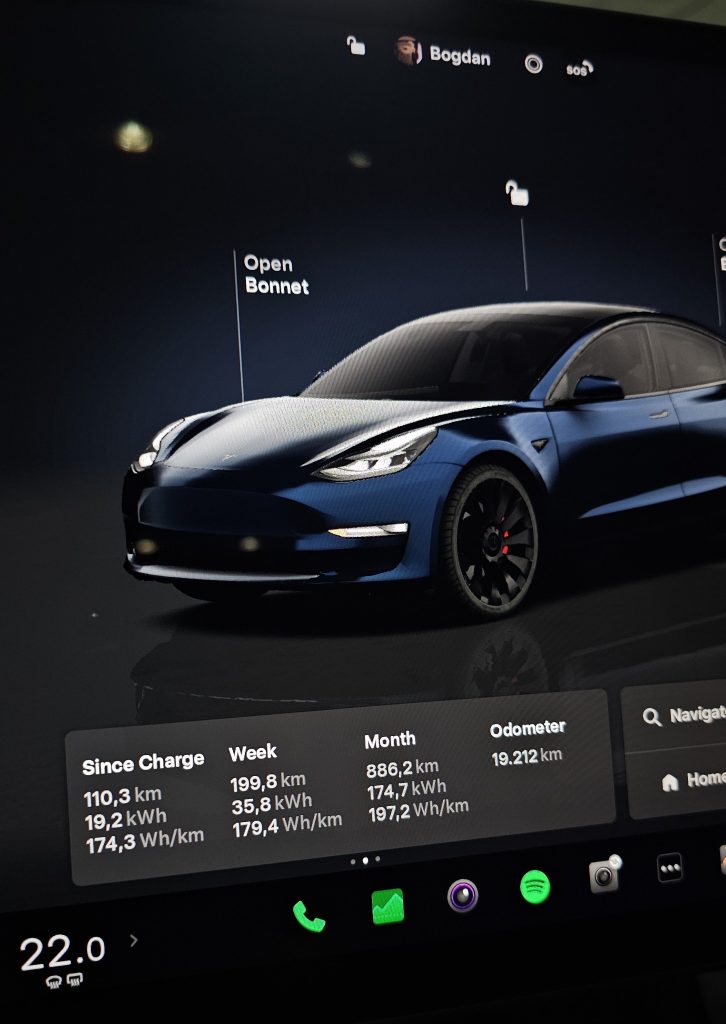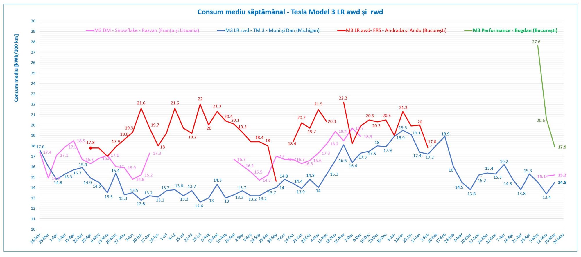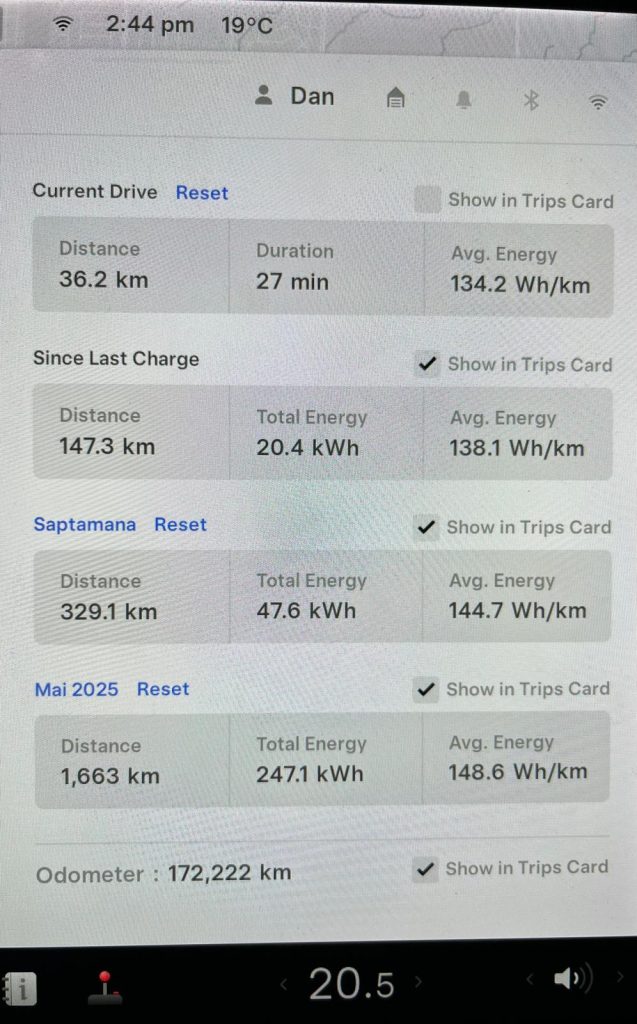 Cu un singur șofer la volan în cele două zile de plimbări, TM 3 a acumulat 329 km cu un consum mediu de 14.5 kWh/100km, doar puțin mai scăzut decât media pentru luna mai (14.9 kWh/100km).