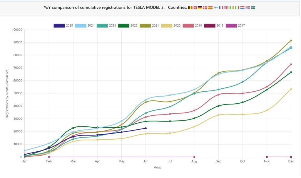 Tot în 2017 a fost lansat și Model 3 în SUA, după care a ajuns oficial în Europa în 2019. De atunci au fost înmatriculate aproape 480.000 exemplare în Europa de vest (Sursa: EU EVs), venite mai întâi de la fabrica din Fremont (California), iar începând din 2020 de la cea din Shanghai.