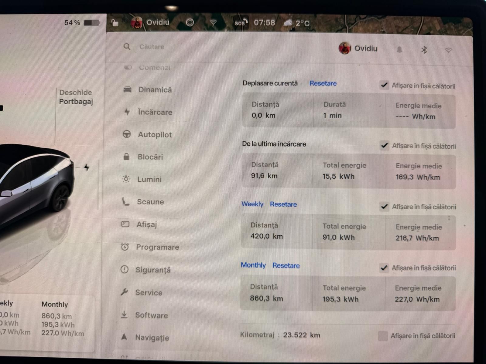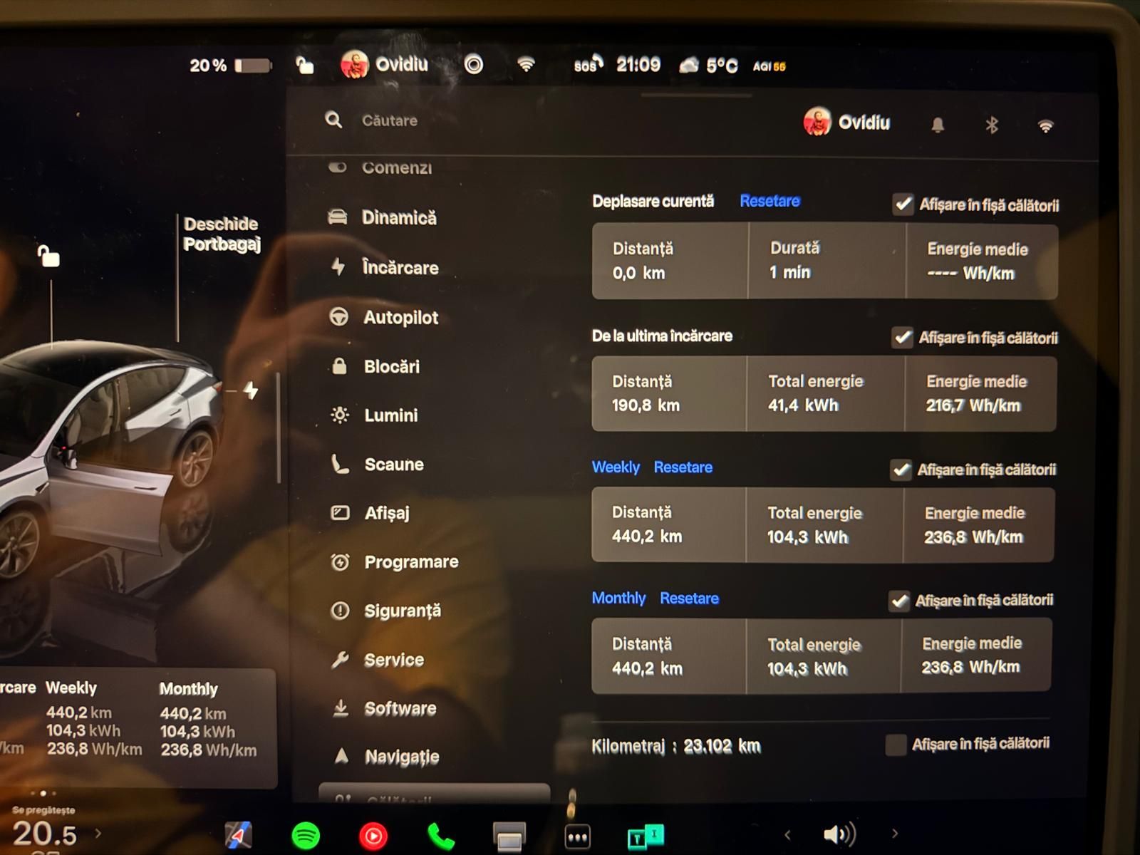 Drumuri doar prin oraș cu o viteză medie de 20,3 km/h, aproape 22 de ore petrecute la volan și 0 costuri cu încărcarea fiind efectuate numai de la birou, conform TeslaMate.