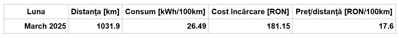 În luna Martie IONIQ 5 a parcurs 1032 km cu mine și Carla la volan. Costurile cu încărcarea au fost 181 RON (17.6 RON/100km). Am avut parte și de încărcări de la instalația fotovoltaică a părinților.