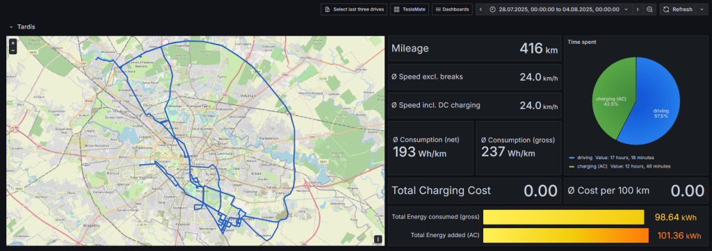416km parcurși cu o viteza medie de 24km/h iar consumul mediu ar fi undeva la 18,3kWh/100km pentru că teslamate tinde să arate cu cam cu 10wh în plus față de bordul mașinii, aparent incluzând și alte consumuri în staționare. Costuri 0 cu încărcarea, fiind efectuate doar de la birou din FV.