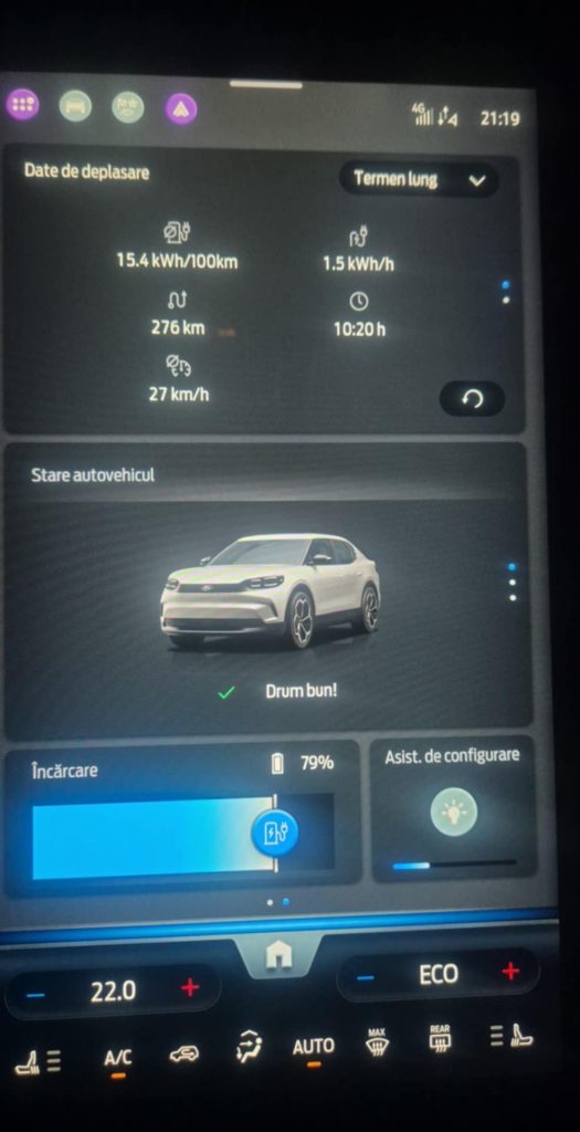 Pe lângă puținii kilometri făcuți în timpul săptămânii în oraș, weekend-ul a adus o deplasare până la Borsec. Am plecat de acasă cu 80% SoC, și am ajuns la Toplița cu 51%, unde am încărcat la singura stație CCS, de 30 kw, până la 80%. Deplasarea până în Borsec a mai scăzut din procentajul bateriei până la 71 %.