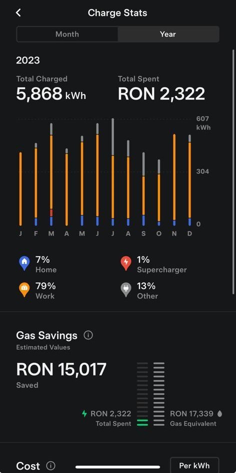 Aici vedem că au fost necesari 5,88 MWh pentru distanța de 23.000 km din care gratuiți au fost 4,8 MWh. La birou am încărcat peste 4,64 MWh, acasă 459 kWh cu un cost de 345 RON, iar restul de încărcări plătite au fost efectuate în diverse deplasări inclusiv concedii.