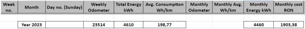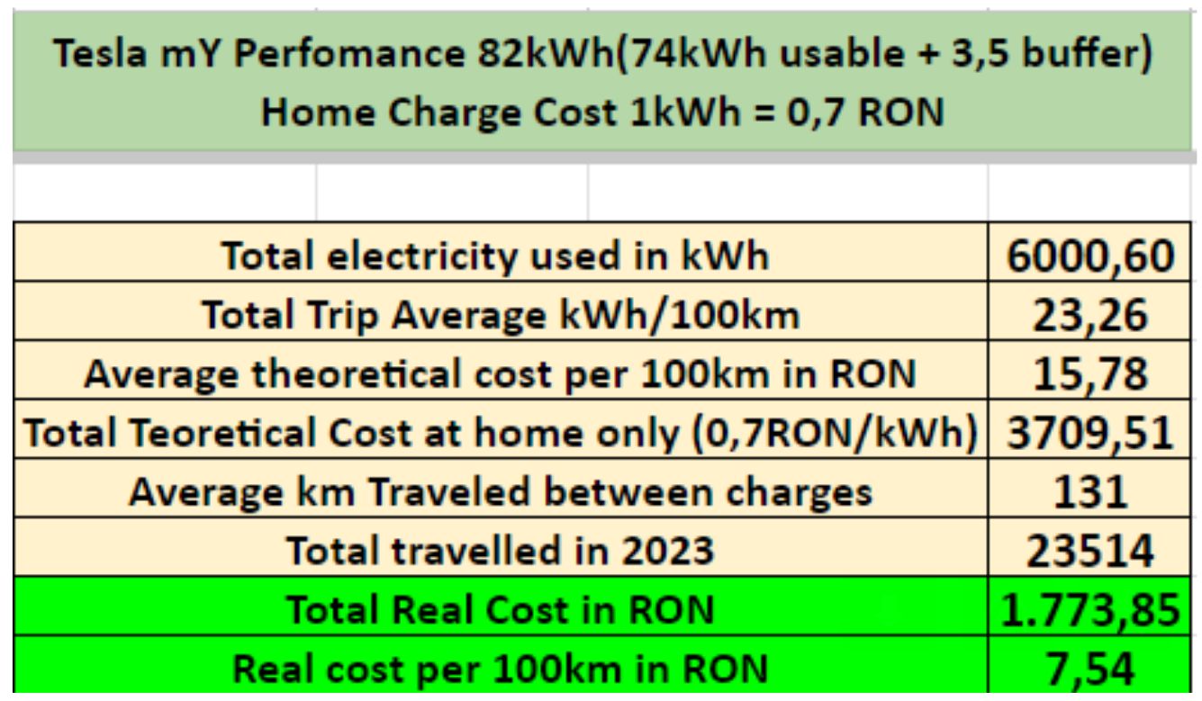 Dacă aș fi încărcat acasă doar cu 0,7 RON/kWh aș fi avut un cost de aproape 16 lei pentru 100km parcurși în 2023.
