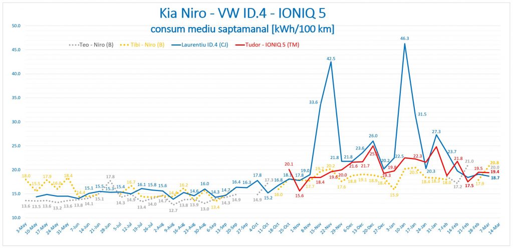 Pentru amatorii de statistici am adăugat graficul consumului mediu săptămânal, din nou cu valori pentru ambele Kia Niro, pe baza informațiilor comunicate de Tibi și Teo.