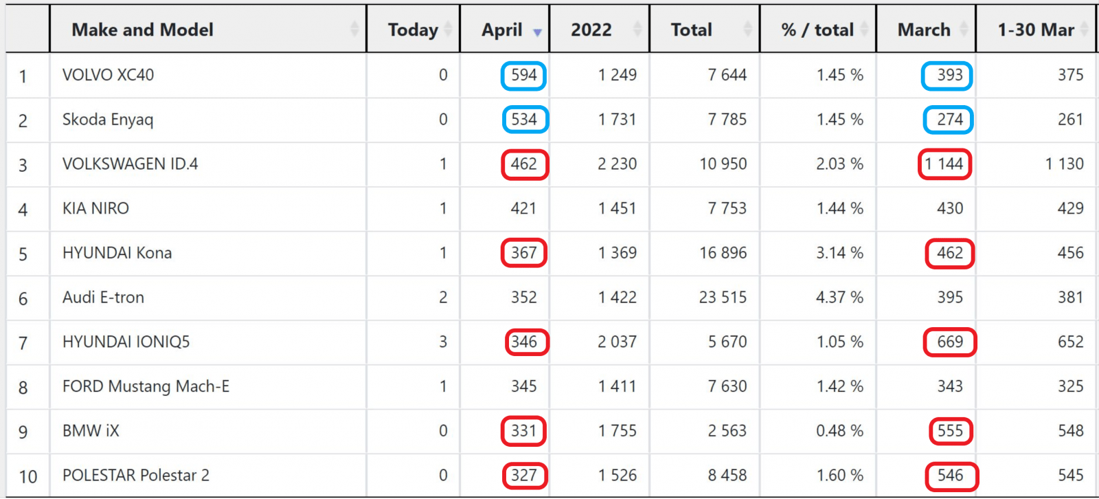 Am marcat cu albastru înmatriculările care au crescut față de luna martie și cu roșu pe cele care au scăzut, iar trei modele nu sunt marcate, înmatriculările fiind în limita fluctuațiilor normale de la lună la lună.