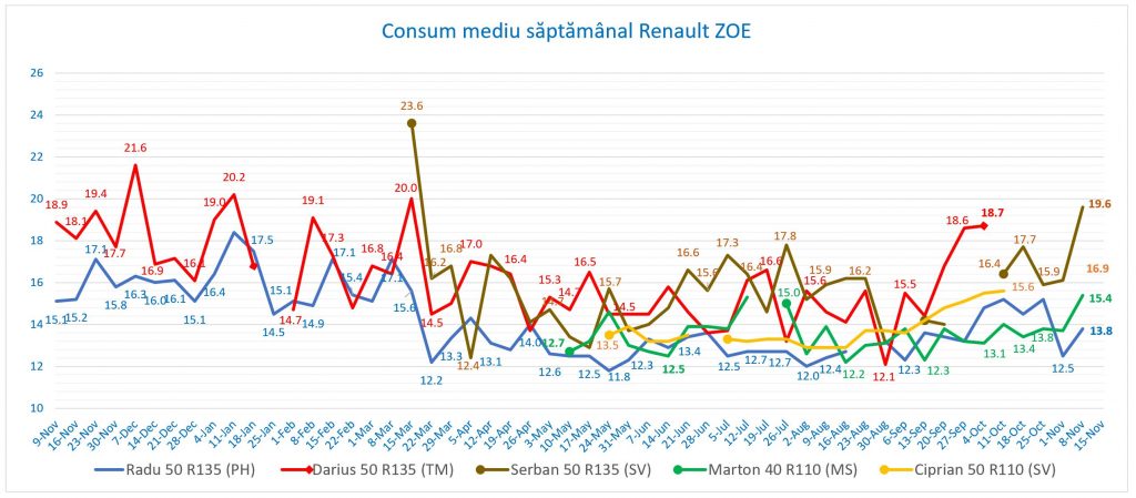 Săptămâna trecuta Zoe a parcurs 410 km cu un consum de 15.4 kWh/100 km și viteză medie de 29 km/h.