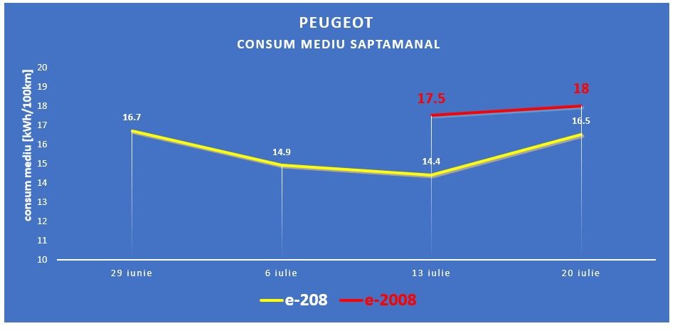 La fel ca în cazul celor trei Kona pe care le urmărim cu atenție, cu toate ca modul de utilizarea al celor doua Peugeot-uri diferă și mașinile sunt diferite ca formă și greutate, motorul, acumulatorul și electronica comună fac ca diferențele de consum sa nu fie prea mari, cu toate că Siliviu se declară un conducător sportiv, ce utilizează mașina în modul sport, pentru plăcerea pură de a conduce electric.