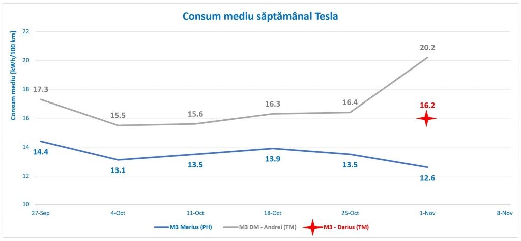 În timp ca Marius (PH) și Andrei (TM) au ajuns la a șasea săptămână de raportare, Darius a plasat prima steluță pe graficul de consum cu valoarea medie realizată pe drumul de la București la Timișoara.
