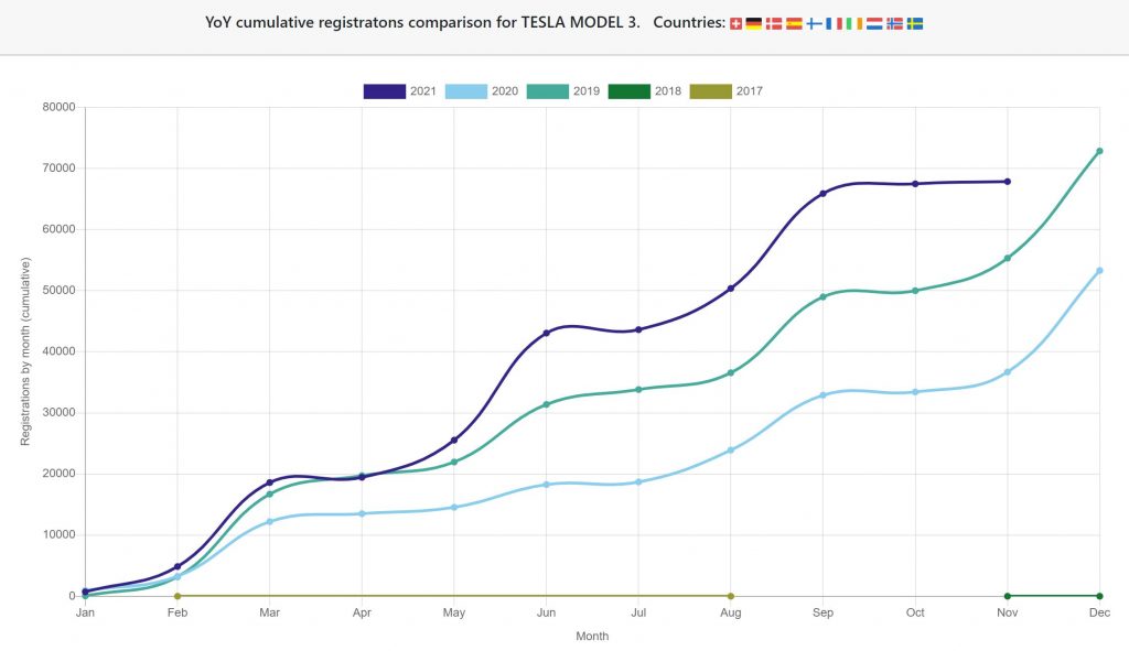 Ajuns în Europa în 2019 la mijlocul lunii februarie, Model 3 avea să devină în scurt timp un succes la public, chiar dacă presa de specialitate i-a făcut o primire foarte rece. Livrările cumulate pe principalele zece piețe europene, dovedesc că cererea pentru Model 3 este în continuare în creștere.