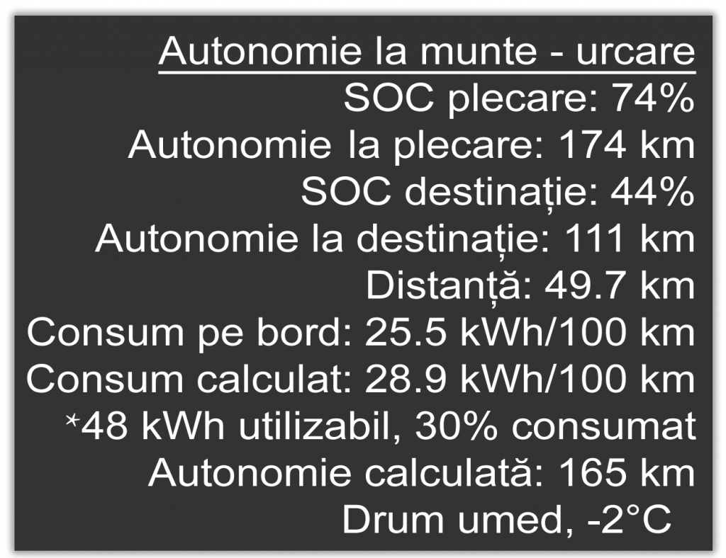La întoarcere consumul jos în Laz a fost doar 7.2 kWh/100 km, dar eu am preferat să-l calculez și asta e ceea ce a reieșit din calcul. Pentru ambele segmente, urcare și urcare + coborâre am decis să calculez și autonomia maximă, bazându-mă pe procentul de baterie consumat pentru a parcurge numărul de kilometri de pe bord.