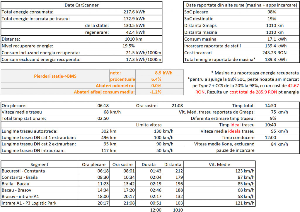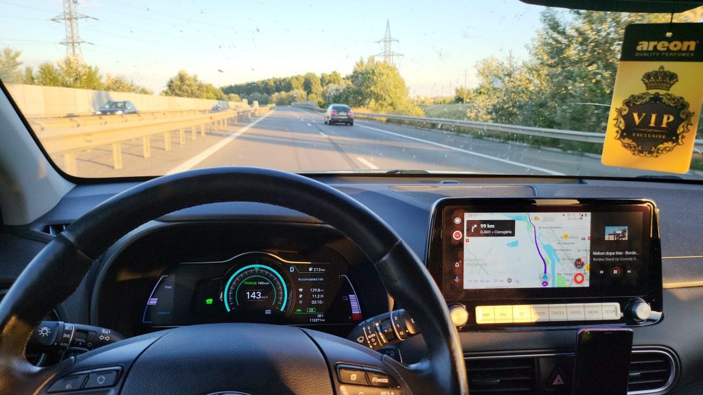 Cu siguranță nu în cazul Konei, dar asta nu se poate generaliza la restul mașinilor electrice. Între Kona și alte mașini de până în 200 Cp, mergând cu traficul, la modul cel mai real diferența nu va fi mai mare de o oră. Asta chiar și în condițiile unei infrastructuri de încărcare ce nu este optimă pentru pentru Kona. Am explicat de foarte multe ori avantajul de a nu avea o cutie de viteză, ceea ce îți permite să negociezi mai ușor un punct de stres în trafic (de ex când cineva merge cu 20km/h pe un sector de drum care permite mult mai mult, dar fără ca această viteză să fie dictată de condițiile de drum și trafic – așa cum fac „șoferii de duminică” ce se apucă de fotografiat peisajul din mersul mașinii). - Diferențe majore între iarnă și vară. Am explicat astă iarnă că din cauza unor probleme de sănătate și a situației de la Brașov, am pierdut destul de mult timp. Nu am scăzut acel timp (și nici nu sunt de acord să fac asta) pentru că astfel de situații fac parte din „viața” unui traseu de 1000 km. Nu tot timpul se aliniază astrele. Astă iarnă, a cam trebuit să deviez mai mult de la traseu pentru stațiile de încărcare (cam 50km în plus), și am făcut cu 54 de minute mai mult. Având în vedere că ocolirea a fost făcută pe traseu urban, e evident că la Kona, la drum lung, nu prea sunt diferențe între vară și iarnă. Am mai zis că e o mașină al naibii de predictibilă și constantă. Supărător chiar aș zice.