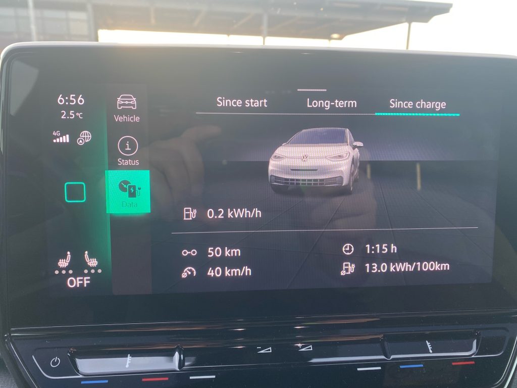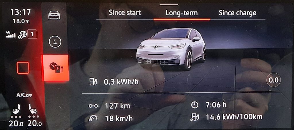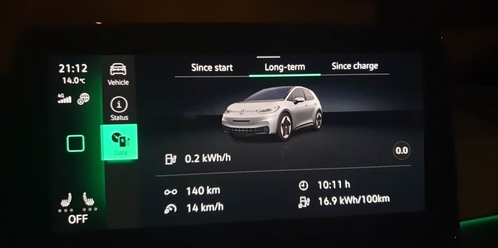 Din traseul nu deosebit de prietenos pentru o mașină electrică, cu diferențe de nivel (din ultimii 600m – 400m doar în urcare), relativ scurt , temperaturi sub 10°C , cu 19°C temp. habitaclu și 2 persoane la bord, a rezultat un consum mediu de 32 kWh/100km (echivalentul unor valori între 3,3 L/100km și 12 L/100km * )