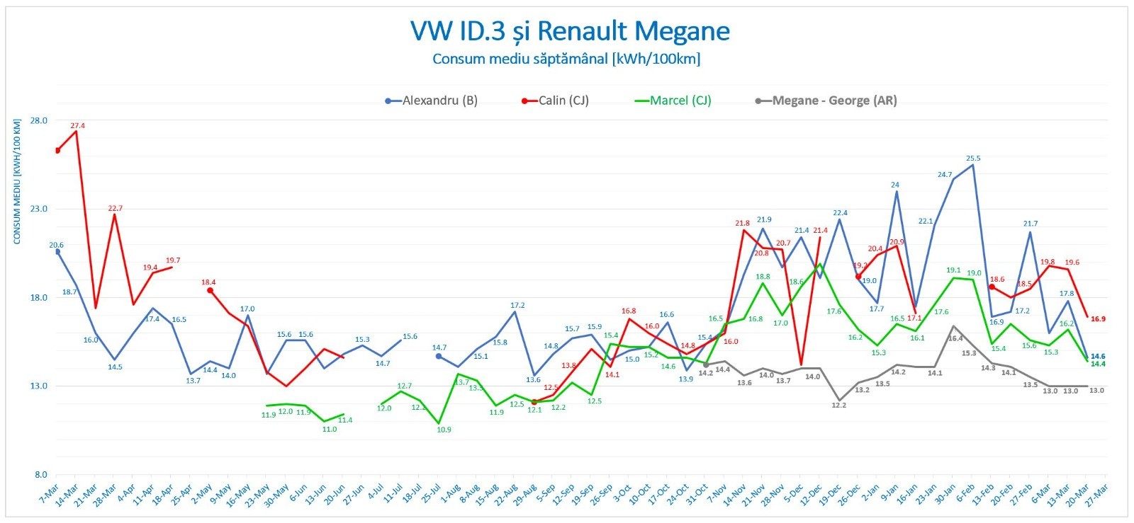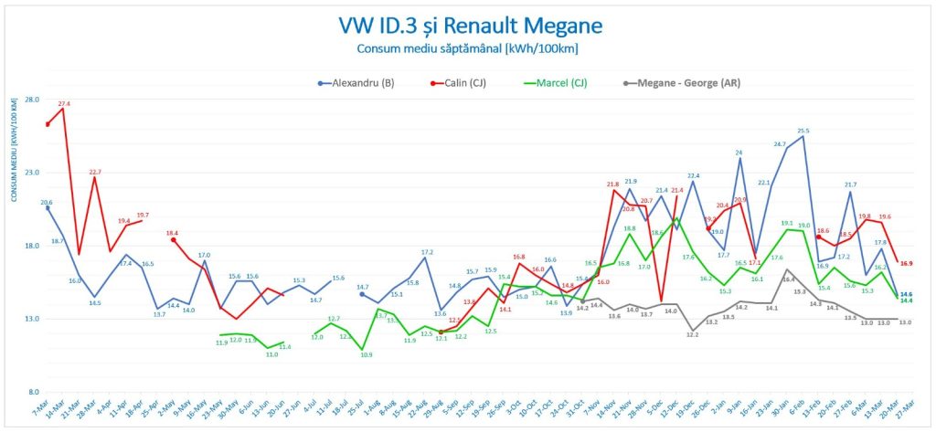 Temperaturile din ce în ce mai ridicate, aferente lunii martie, își fac simțită prezența în graficele săptămânale de consum, electromobiliștii noștri înregistrând consumuri în scădere. Acestea fiind spuse, haideți să aruncăm o privire asupra datelor înregistrate de ID.3-urile lui Marcel(CJ), Alex(B), Călin(CJ) și Megane-ul lui George (AR).