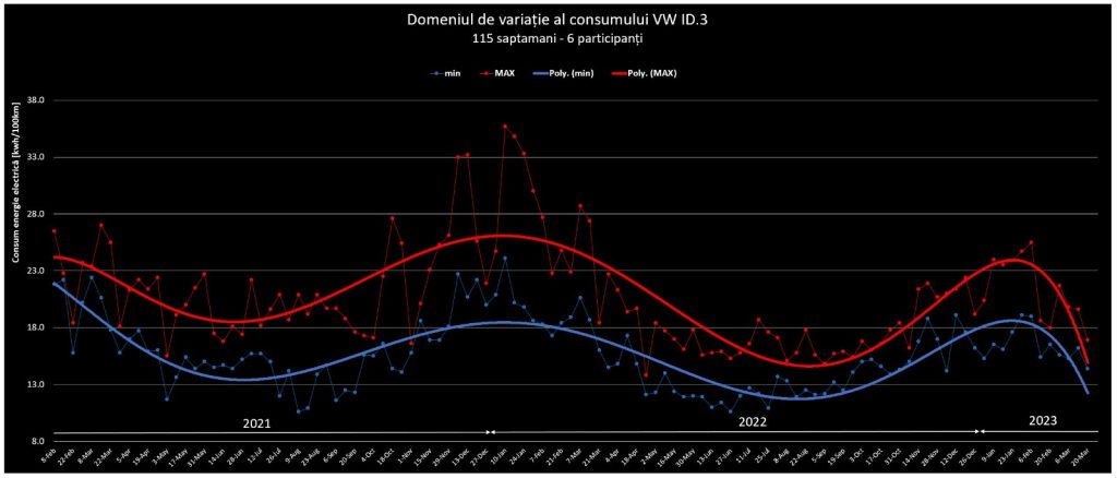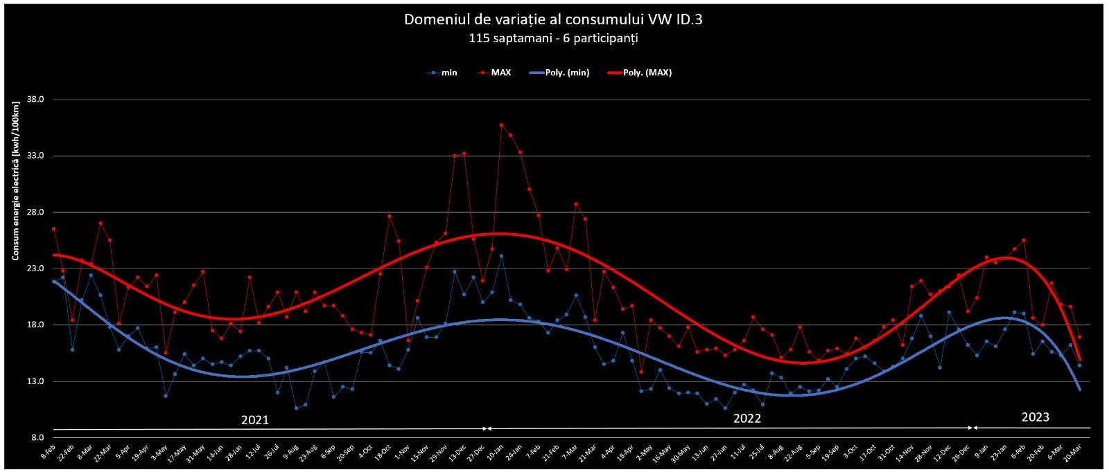 Asa cum scriam în paragraful introductiv, creșterea temperaturii a dus la scăderea consumului pentru toate cele trei ID.3-uri.