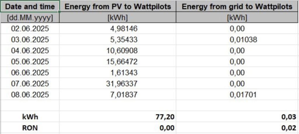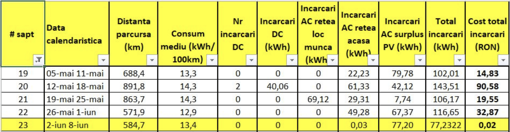 - Încărcări: 59 kWh (toți din PV)